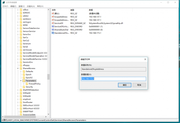 ● 在从Build 14291升级到这个版本之后,尝试连接到Miracast接收器会出现连接失败的问题。解决方案是脱离这种状态之后,然后访问注册表项“HKEY_LOCAL_MACHINE/SYSTEM/CurrentControlSet/Services/SharedAccess/Parameters”,然后选择“StandaloneDhcpAddress”将值从“192.168.173.1”修改为“192.168.137.1”(类型为REG_SZ)。然后重新尝试和Miracast设备的连接。
