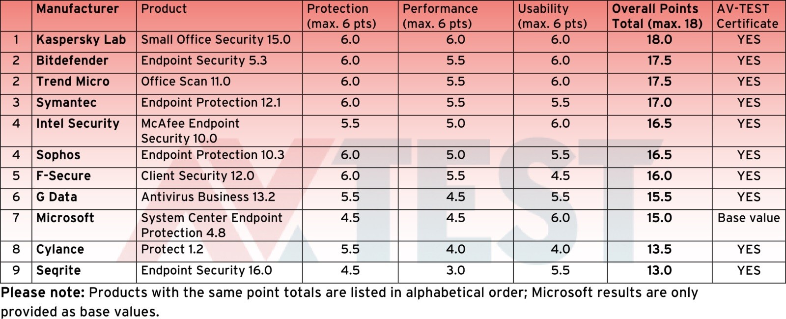 微软的System Center Endpoint Protection 4.8,在保护和性能当中获得了4.5分,在可用性测试当中得到6分满分。这次测试将其总分15分作为基准得分。Cylance Protect 1.2 和Seqrite Endpoint Security 16.0在测试当中总分分别是13.5和13分,低于基准得分。不过,Intel Security、Sophos、F-Secure和G Data产品总得分均超过15分门槛。