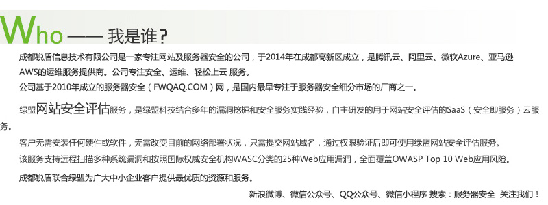 成都锐盾信息技术有限公司旗下服务器安全网联合绿盟科技推出网站安全评估服务,给您的网站做次体检。